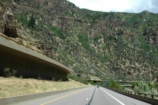 OK, this is not a webcam. You are looking at Glenwood Canyon in Colorado on I-70, travelling east en route to Denver. It's one of the most amazing drives in the country - note that there is not enough room for four lanes of traffic so eastbound and westbound lanes are on split levels. What you can't see is a river running through the canyon to the right, underneath the eastbound lanes. Breathtaking.